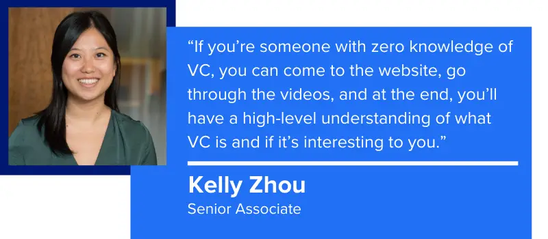 "Si usted es alguien que no tiene conocimiento de VC, puede ir al sitio web, navegar por los videos y, al final, tendrá un alto nivel de comprensión de lo que es VC y si es adecuado para usted. Interesado", Kelly dijo.
